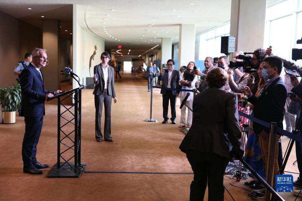 9月12日,在位于纽约的联合国总部,匈牙利外交官克勒希宣誓就任第77届联大主席后出席记者会。新华社记者 谢锷 摄