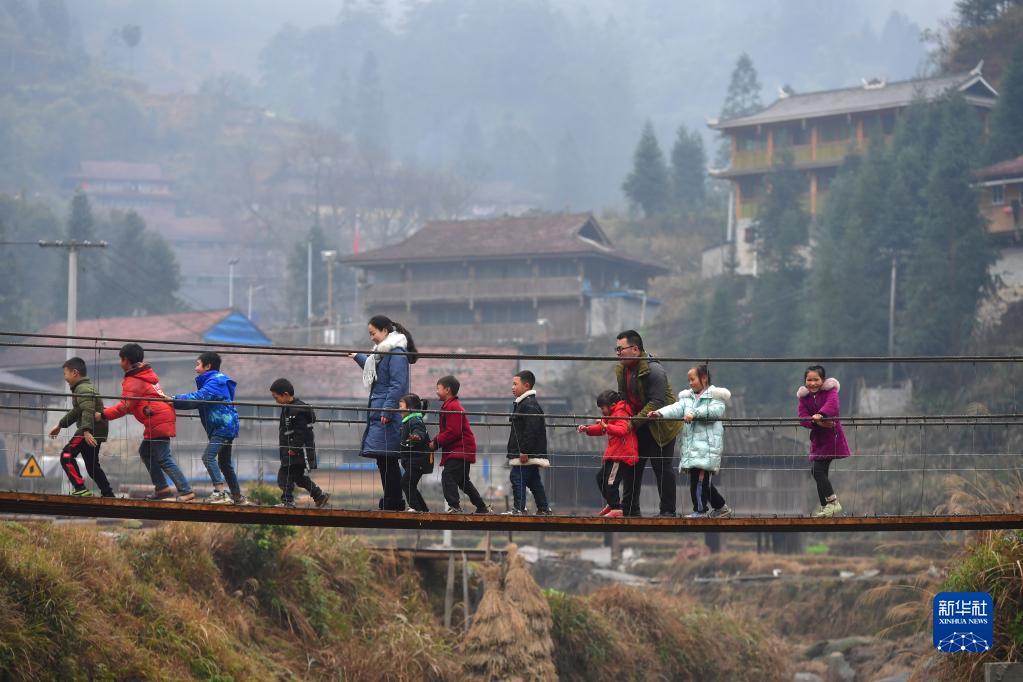 在位于广西融水苗族自治县和贵州省从江县交界的乌英苗寨,郑昌昊(右三)和妻子吴晗(左五)带着孩子们玩耍(2021年1月30日摄)。郑昌昊是广西柳州市委宣传部干部,曾于2020年4月至2021年5月在乌英苗寨担任驻村工作队队员,吴晗曾多次到乌英苗寨教学点支教。新华社记者 黄孝邦 摄