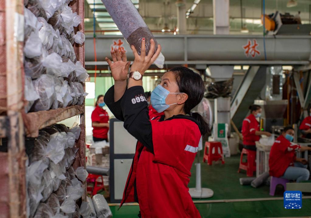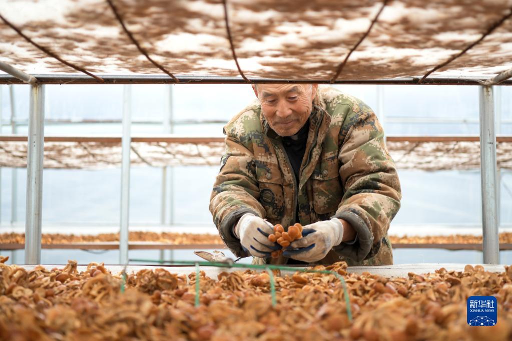 在黑龙江省绥化市明水县兴仁镇石人村的食用菌种植基地,建档立卡户林德山在晾滑子蘑,他在这里打工年收入在1万元以上(2020年10月11日摄)。新华社记者 王建威 摄