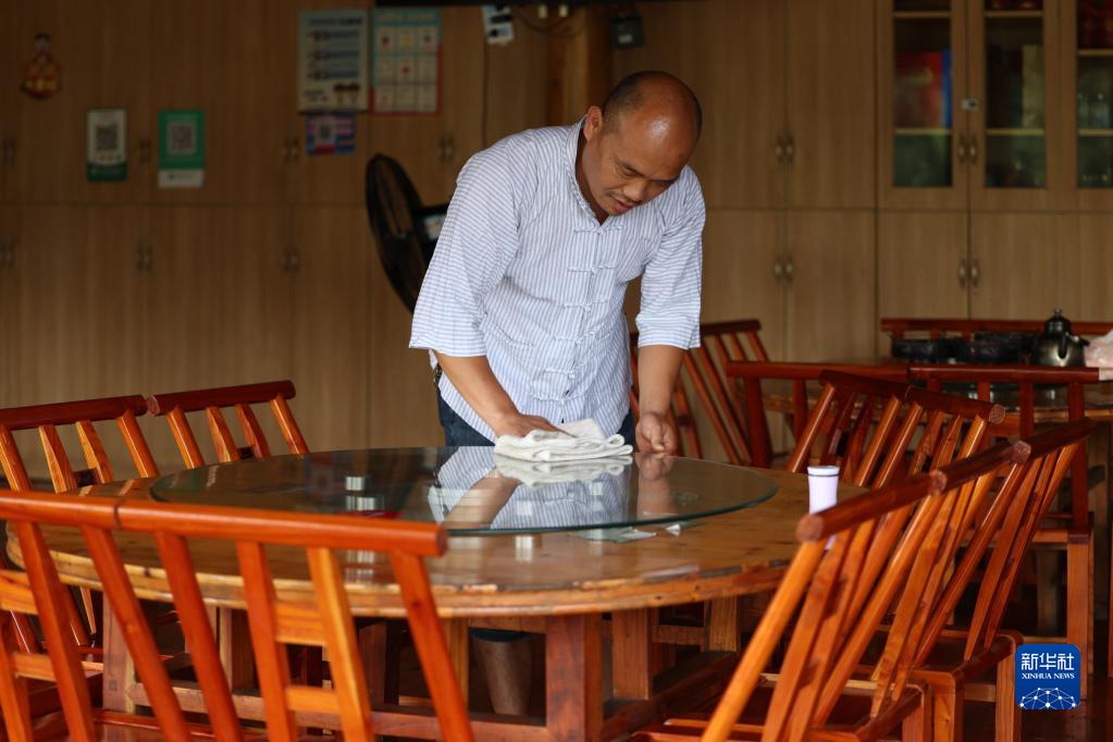 在湖南省湘西土家族苗族自治州十八洞村,杨正邦在自家农家乐打扫卫生(2022年7月2日摄)。新华社记者 薛宇舸 摄