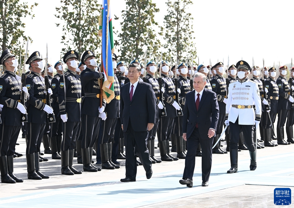 当地时间9月15日,国家主席习近平在撒马尔罕同乌兹别克斯坦总统米尔济约耶夫会谈。会谈前,米尔济约耶夫为习近平举行隆重欢迎仪式。新华社记者 申宏 摄