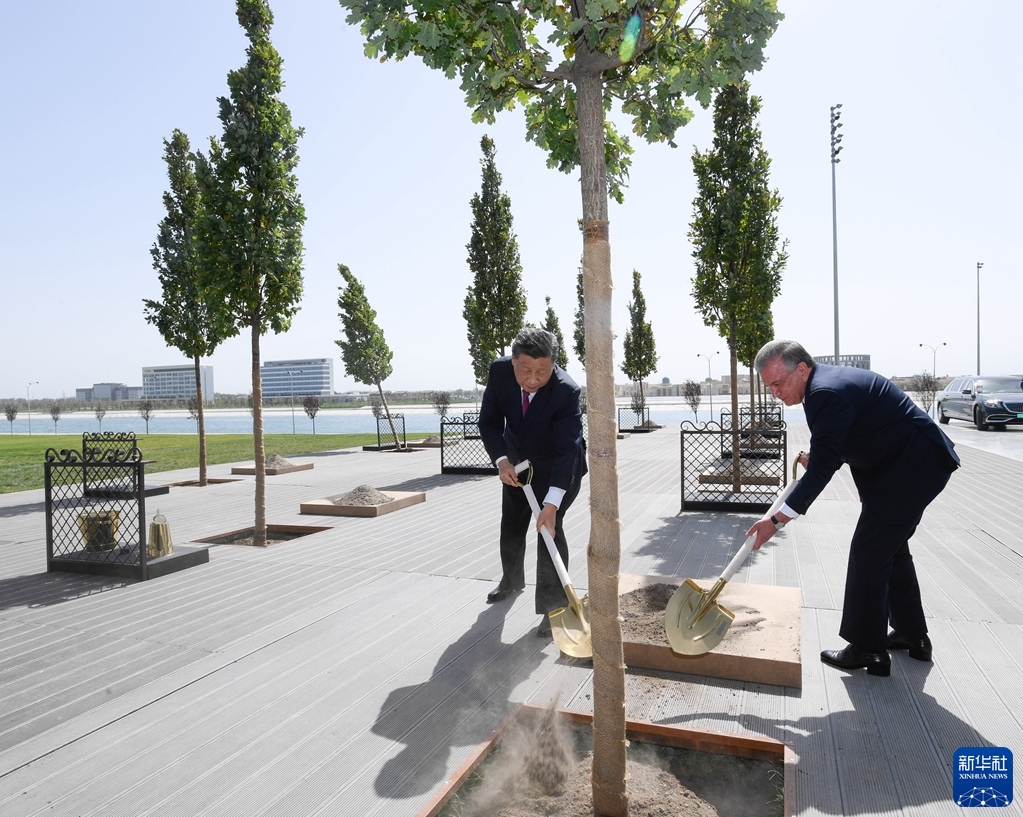 米尔济约耶夫邀请习近平在撒马尔罕国际会议中心北门外广场共同种下一棵橡树。两国元首一道为树苗培土、浇水。橡树代表着长久生命力,象征着中乌友谊枝繁叶茂、生生不息。