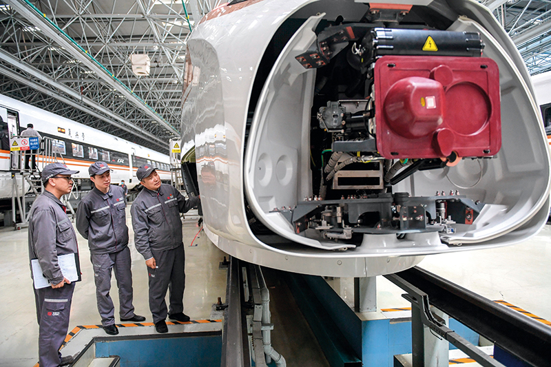 ——在高铁技术装备领域。中国中车以“和谐号”动车组为基础,成功研制拥有完全自主知识产权和世界先进水平的“复兴号”中国标准动车组,其中“复兴号”智能动车组在世界上首次实现时速350公里自动驾驶功能,标志着中国高铁进入智能化时代。