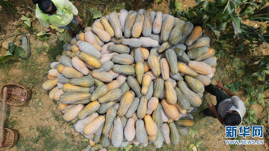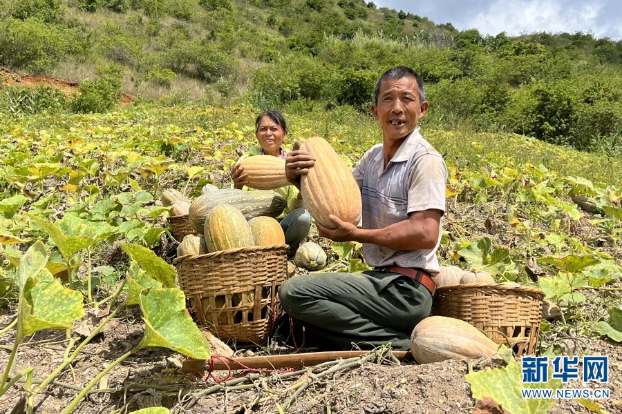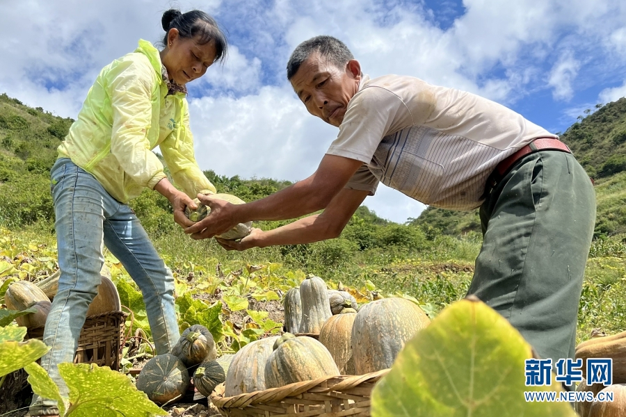 瓜农采摘南瓜(摄于9月2日) 。新华网发(施甸县融媒体中心供图)