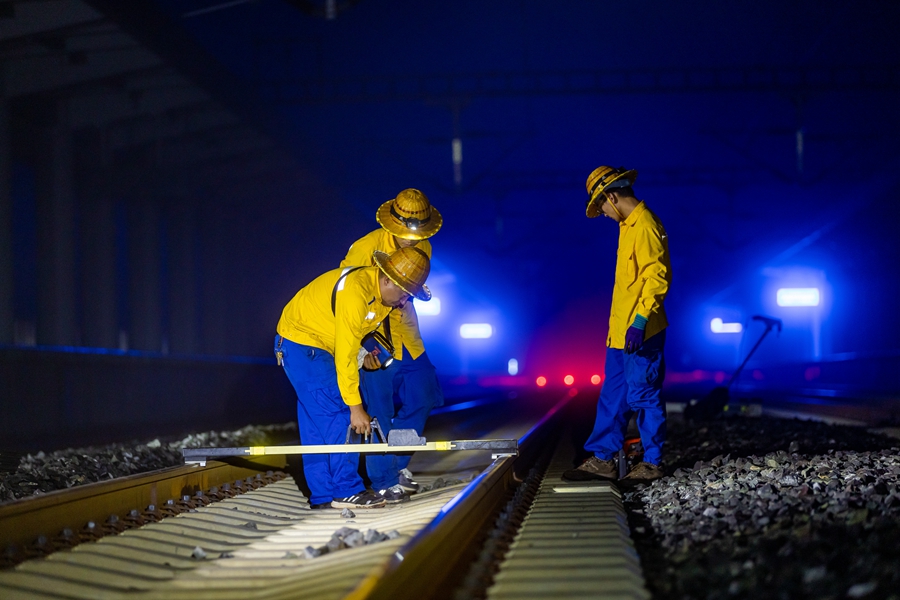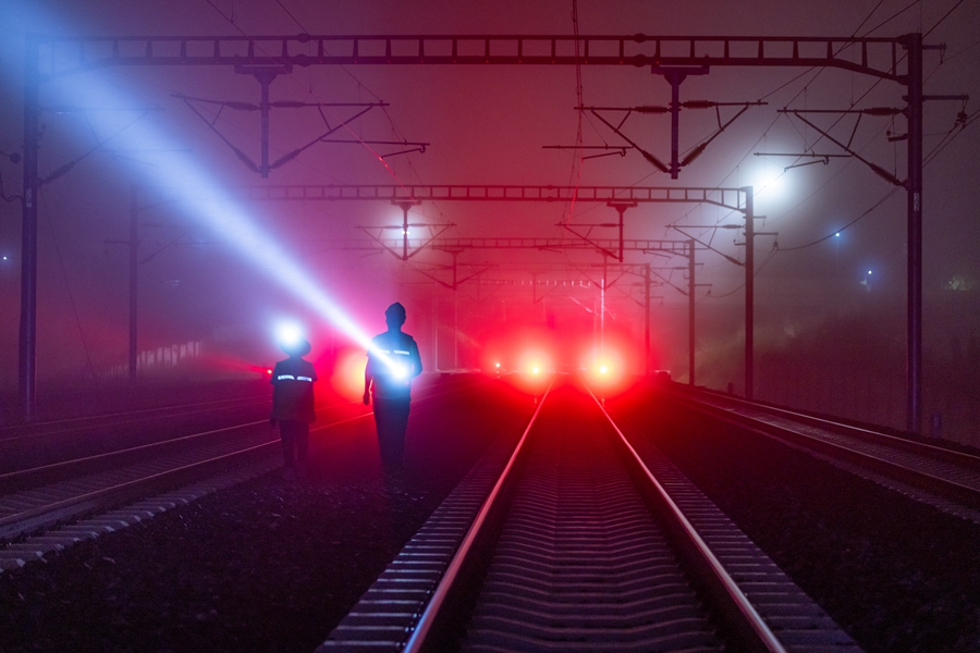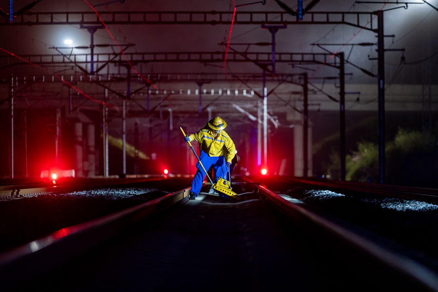 “夜天窗”开启,工作人员对线路上的供电设施等进行检查,确保精调作业人员的人身安全(摄于9月28日)。新华网发(徐章位/摄)