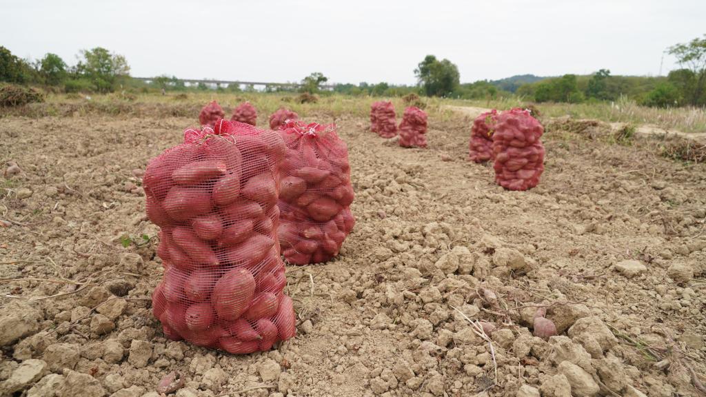农田里堆放的袋装红薯。新华社记者 龚联康 摄