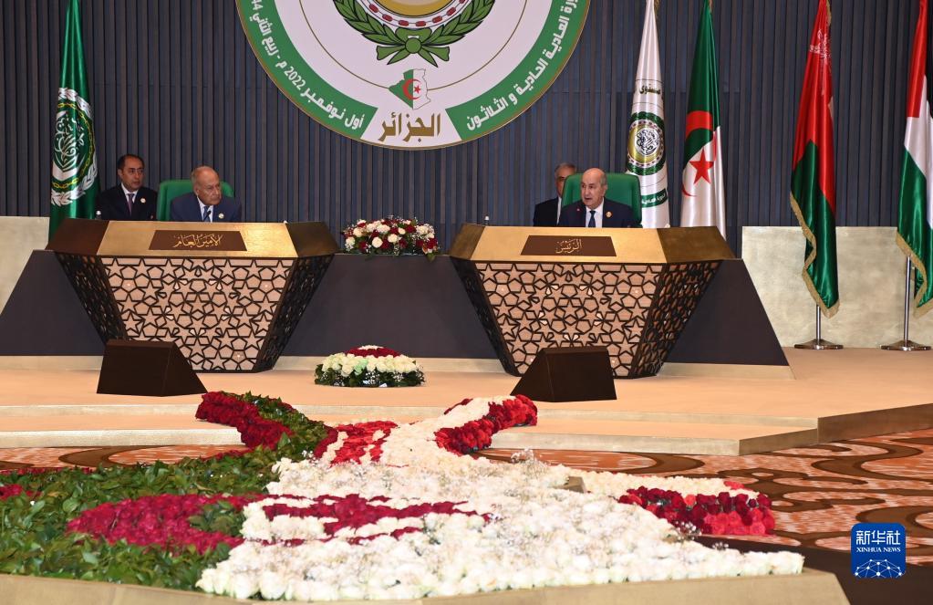 11月1日,阿尔及利亚总统特本(右)与阿盟秘书长盖特在阿尔及利亚首都阿尔及尔出席第31届阿拉伯国家联盟首脑理事会会议。新华社发(阿尔及利亚总统府供图)