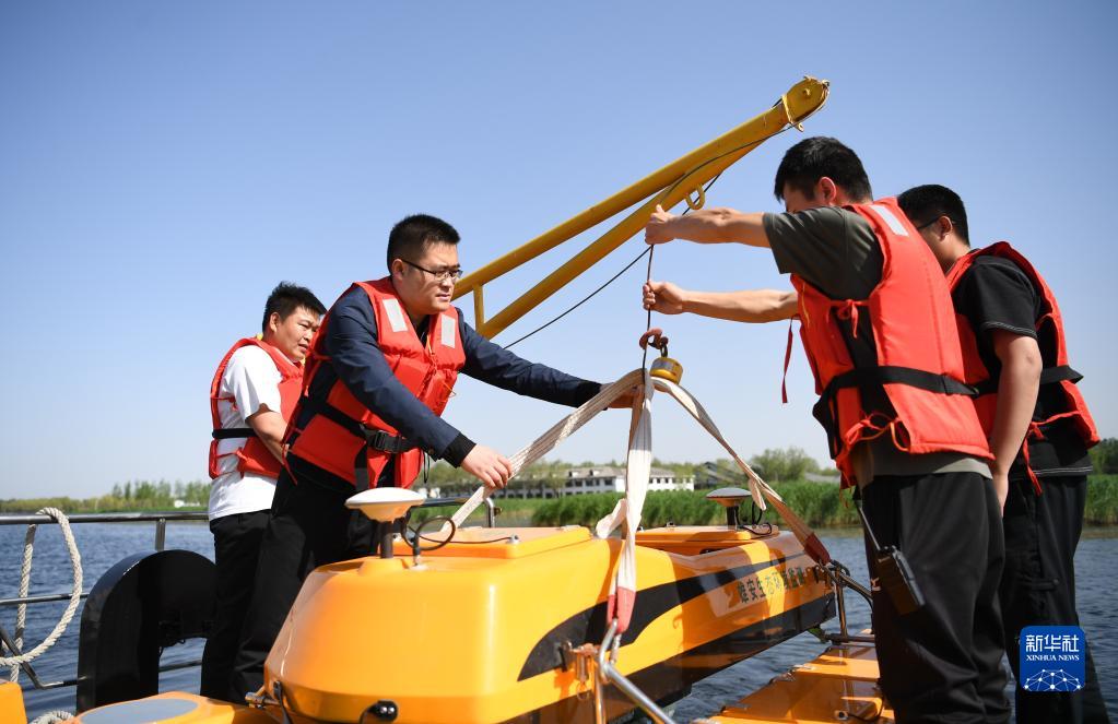 河北雄安新区生态环境局工作人员准备把水质无人监测船下放至白洋淀水面(2022年4月26日摄)。 新华社记者 朱旭东 摄
