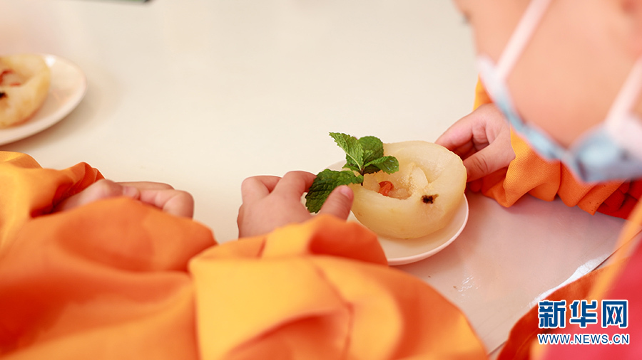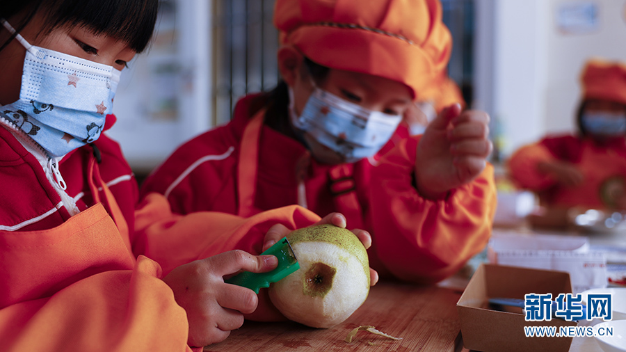 小厨房里,小朋友们正在给宝珠梨削皮,准备制作冰糖雪梨(10月20日摄)。新华网 徐华陵 摄