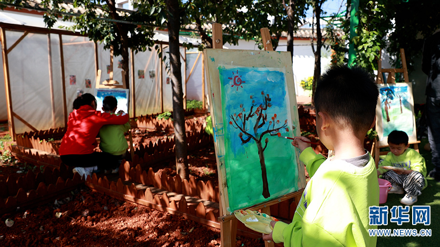 种植园里,小朋友在老师的指导下画梨树(10月20日摄)。新华网 徐华陵 摄