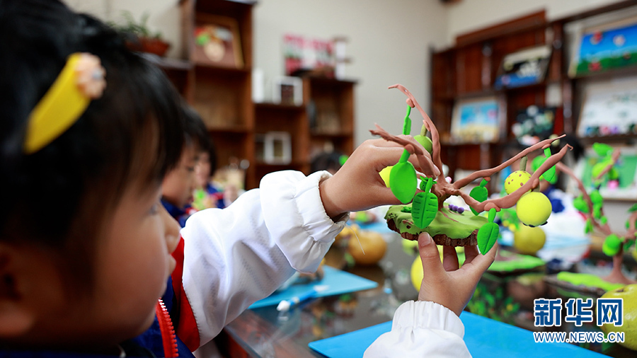 手工课上,小朋友展示关于梨的手工作品(10月20日摄)。新华网 徐华陵 摄