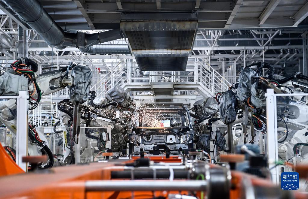 2022年10月17日,在吉林长春中国第一汽车集团有限公司红旗繁荣工厂焊装车间内,焊装机器人在生产线上焊接车身。新华社记者 颜麟蕴 摄