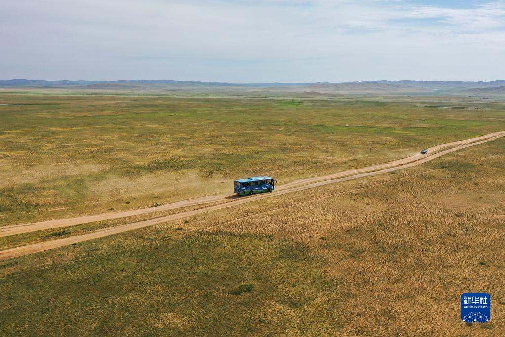 2022年8月17日,苏尼特右旗乌兰牧骑队员乘车前往牧区(无人机照片)。新华社记者 刘磊 摄