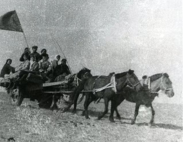 第一支乌兰牧骑队驾着马车,前往牧区演出。(照片由苏尼特右旗乌兰牧骑提供)