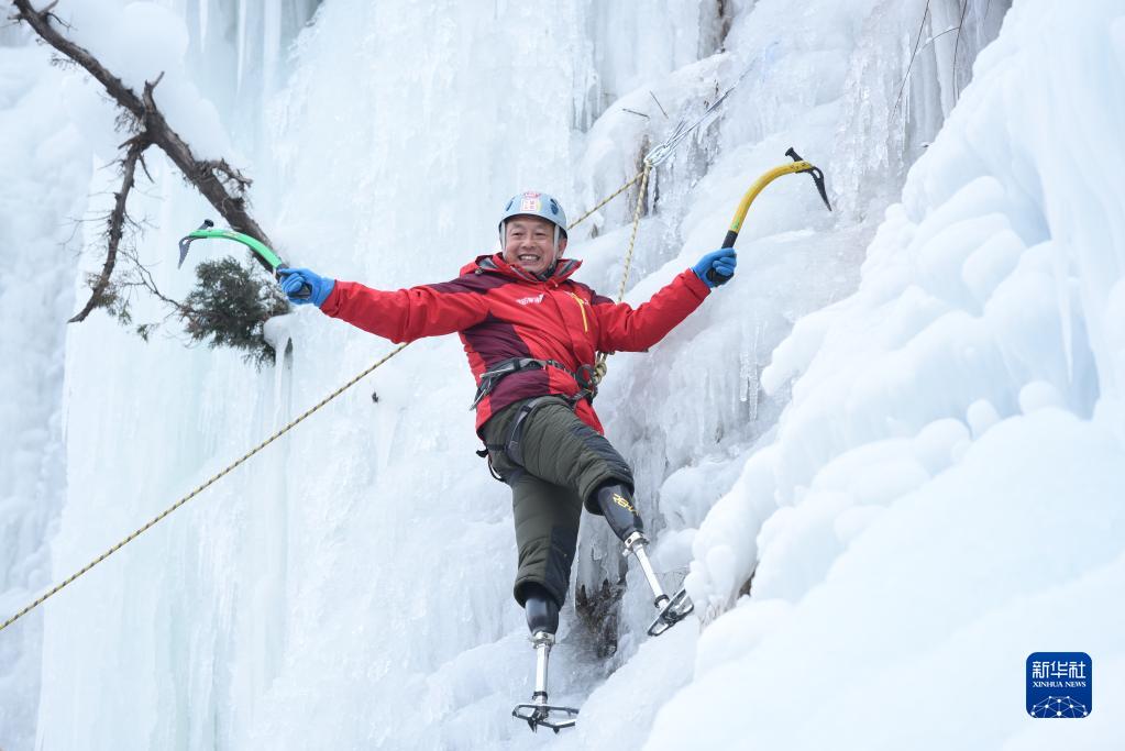 夏伯渝在北京房山区霞云岭攀冰(2017年1月17日摄)。因截肢而中断运动员生涯的夏伯渝,69岁登上珠峰之巅,成为极少数登上珠峰的双腿截肢者之一。新华社发