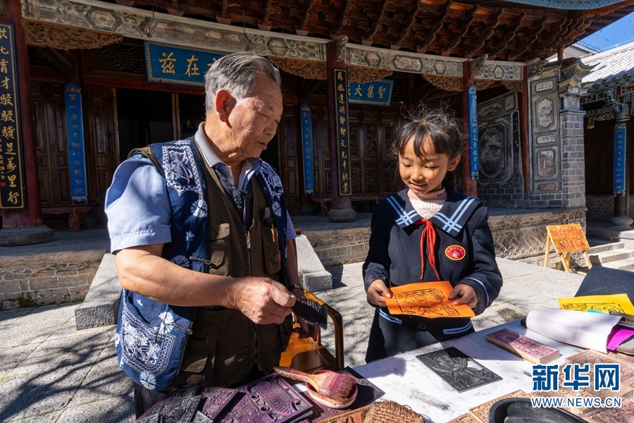 凤翔书院内,老手艺人赵龙生在讲解白族甲马的拓印方法。新华网发(罗新才/摄)