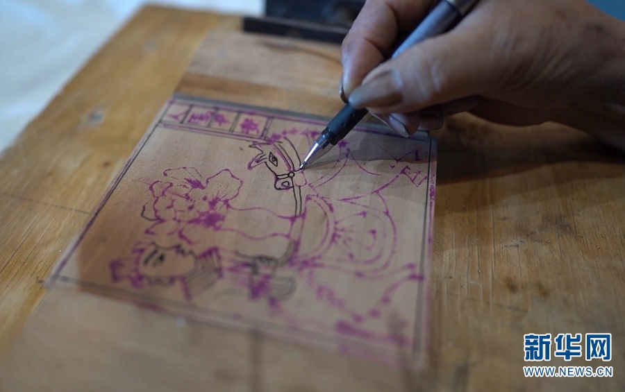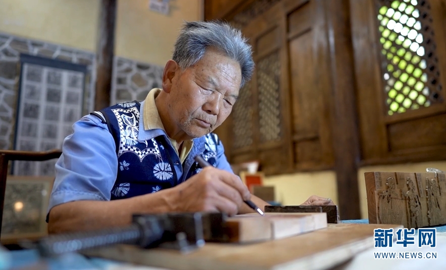 凤翔书院内,老手艺人赵龙生正在刻版。新华网发(罗新才/摄)