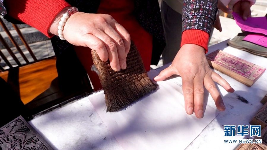 凤翔书院内,民众体验甲马纸拓印。新华网发(罗新才/摄)