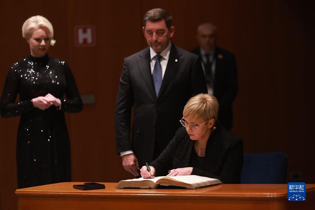 12月22日,在斯洛文尼亚首都卢布尔雅那,娜塔莎·皮尔茨·穆萨尔在总统就职仪式上签字。新华社发(泽利科·斯特凡尼奇 摄)