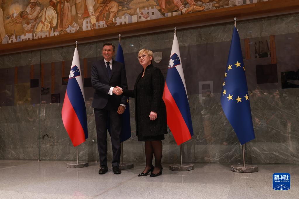 12月22日,在斯洛文尼亚首都卢布尔雅那举行的总统就职仪式上,娜塔莎·皮尔茨·穆萨尔(右)与博鲁特·帕霍尔握手。新华社发(泽利科·斯特凡尼奇 摄)