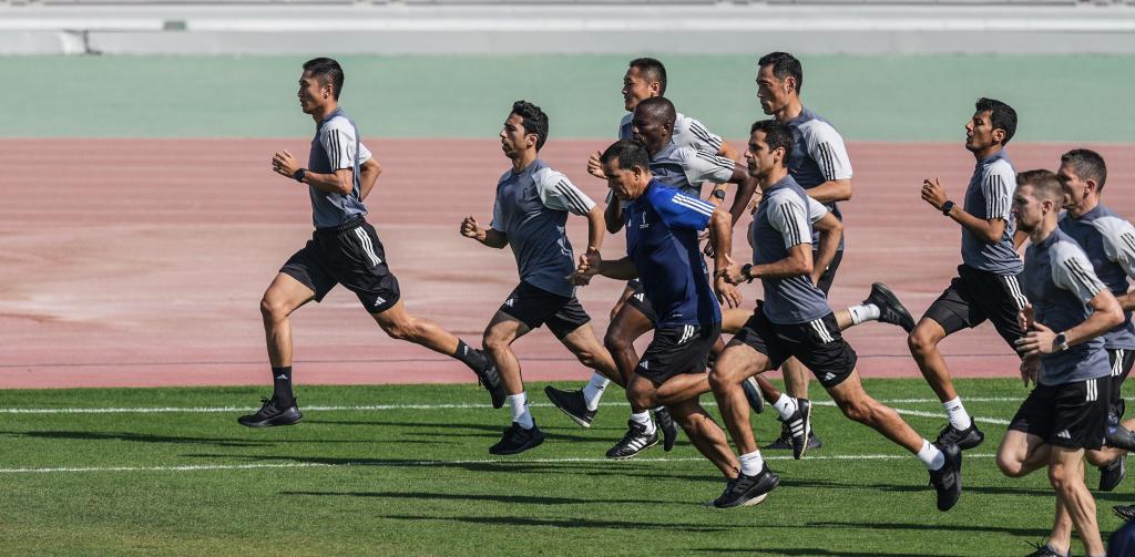 11月18日,入选2022年卡塔尔世界杯裁判员名单的马宁、曹奕、施翔(后左至后右)在卡塔尔体育俱乐部球场进行训练。新华社记者潘昱龙摄