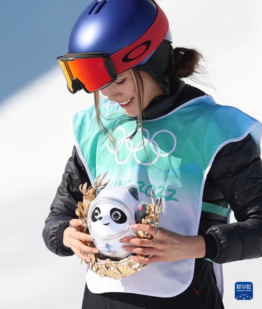 这是2022年2月8日,中国选手谷爱凌在北京2022年冬奥会自由式滑雪女子大跳台颁发纪念品仪式上。新华社记者 丁旭 摄