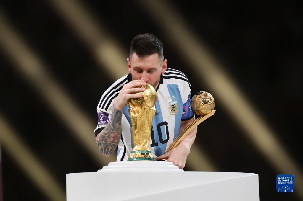 这是2022年12月18日,获得世界杯金球奖的阿根廷队球员梅西在卡塔尔世界杯足球赛颁奖仪式上亲吻大力神杯。新华社记者 曹灿 摄