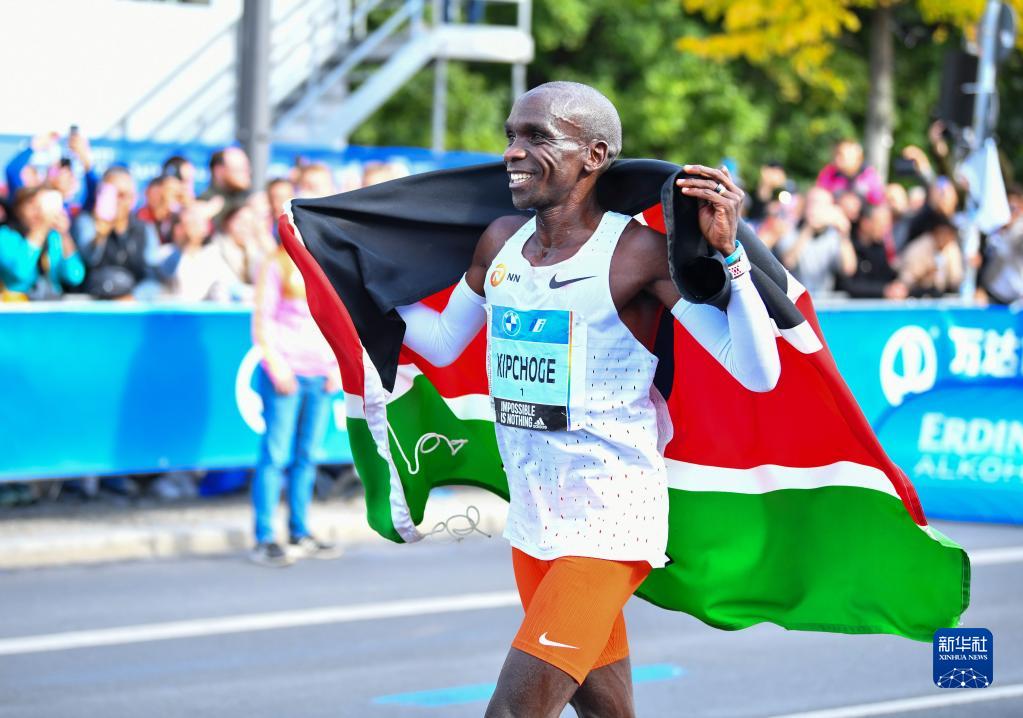 这是2022年9月25日,基普乔格在2022年柏林马拉松赛夺冠后庆祝。新华社记者 任鹏飞 摄