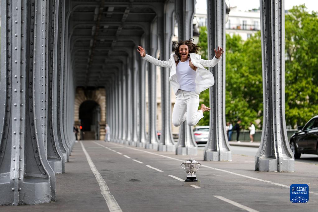 这是2022年6月5日,法国网球公开赛女子单打冠军、波兰选手斯维亚特克在巴黎比尔哈克姆桥与冠军奖杯合影留念。新华社记者 孟鼎博 摄