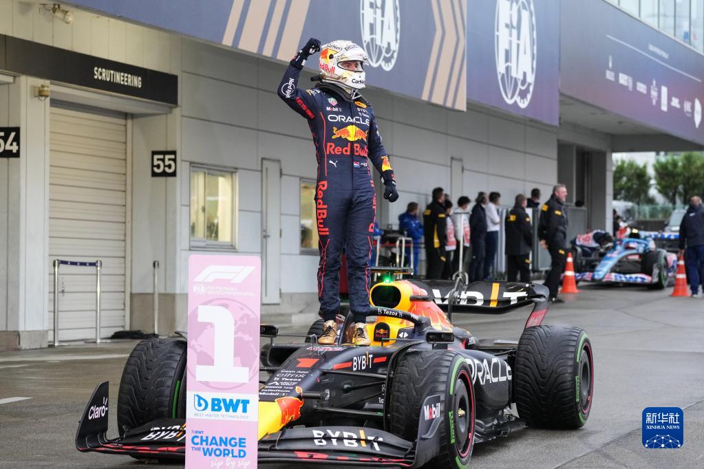 这是2022年10月9日,红牛车队荷兰车手维斯塔潘庆祝获得世界一级方程式赛车锦标赛(F1)日本大奖赛冠军。新华社记者 张笑宇 摄