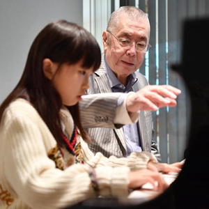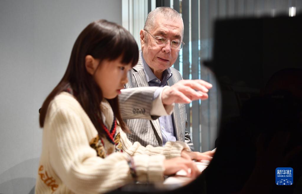 2022年12月9日,钢琴家刘诗昆在香港铜锣湾贝乐思钢琴学院的琴房里指导琴童弹奏。新华社记者 陈铎 摄