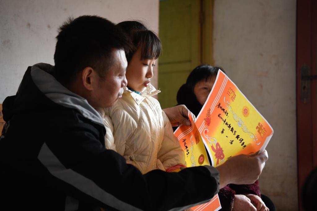 廖大友回到家后,女儿给他递上刚拿到的奖状,她在2022年秋期获得全班数学第一名。新华社记者胥冰洁 摄