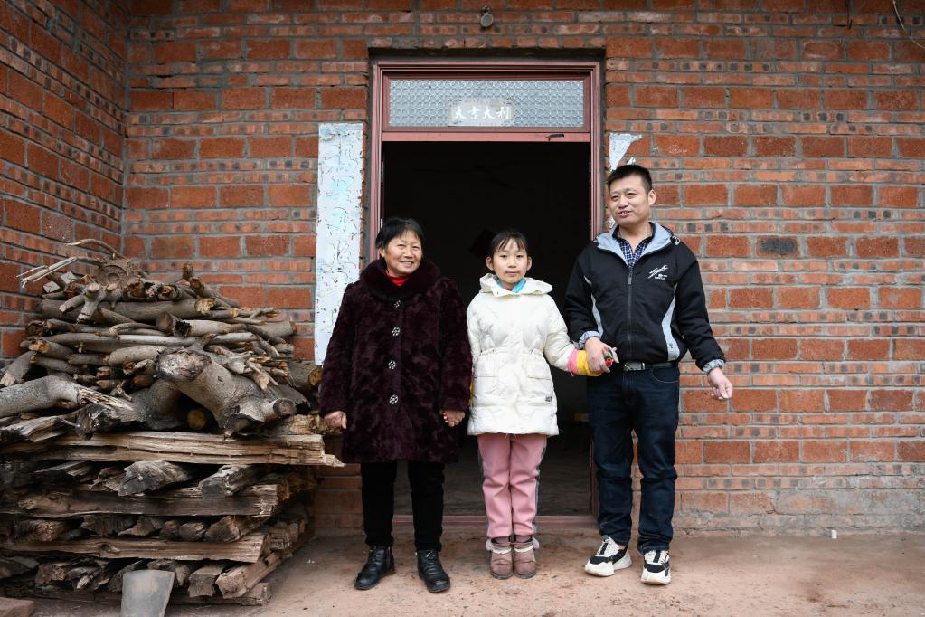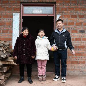 廖大友和女儿廖欣妍、母亲一起拍了全家福,女儿踮起脚尖,想要快快长大。新华社记者胥冰洁 摄