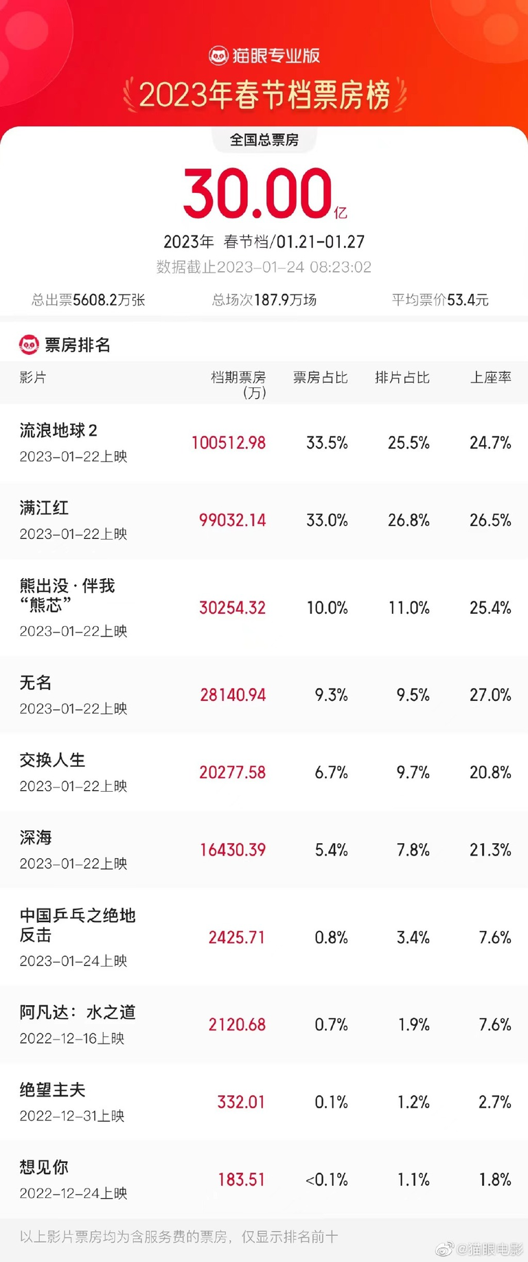 猫眼专业版数据显示,截至2023年1月24日8时23分,春节档(1月21日-1月27日)总票房(含预售)破30亿。《流浪地球2》《满江红》《熊出没·伴我“熊芯”》分列春节档票房前三位。2023年累计36.4亿元,超越北美票房,暂列全球第一。
