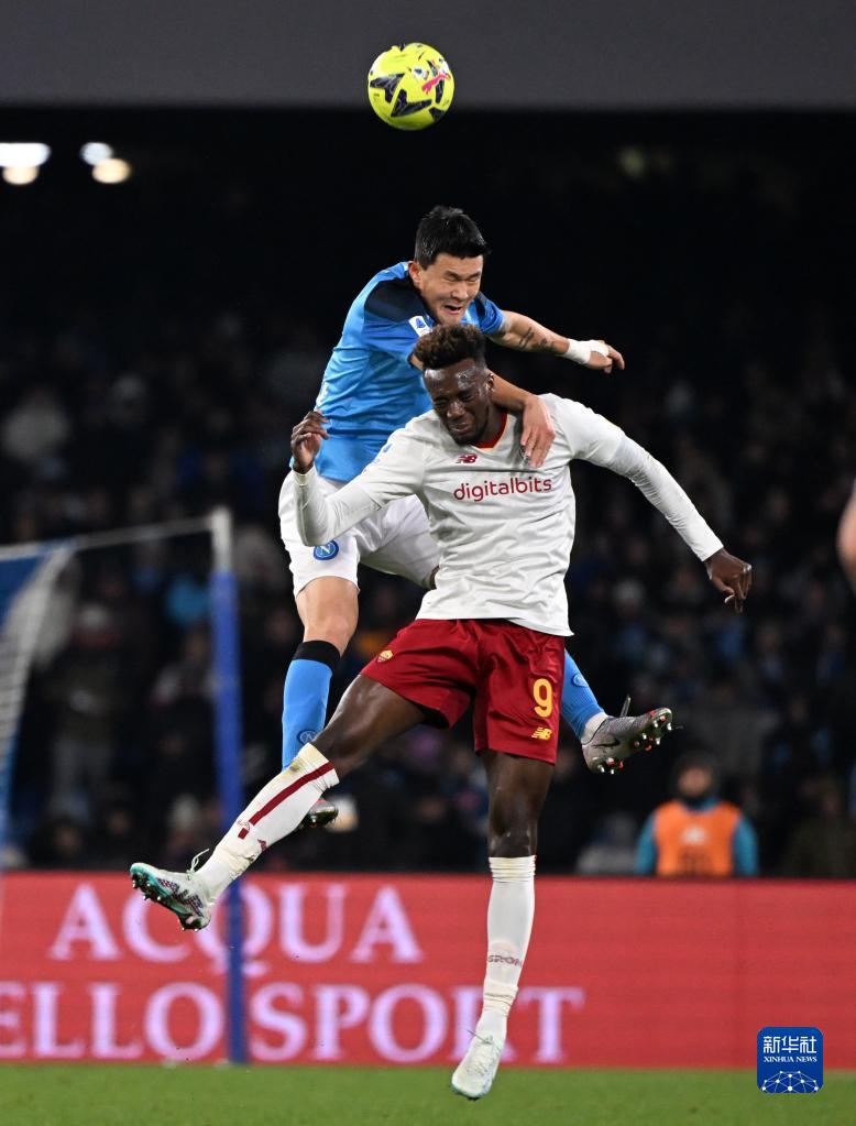 1月29日,那不勒斯队球员金玟哉(左)与罗马队球员亚伯拉罕在比赛中争顶。新华社发(阿尔贝托·林格利亚摄)