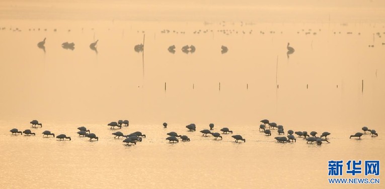 有着“鸟中大熊猫”之称的黑脸琵鹭,是国家一级重点保护野生动物,属全球濒危物种类别之一,常混在白琵鹭群中,在浅水区域疾走滤食。新华网发