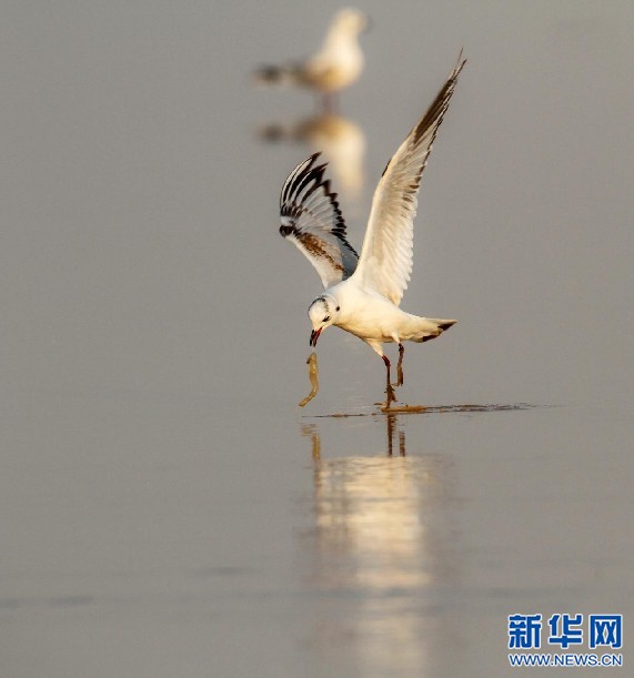 大批的红嘴鸥来到杭州湾湿地公园越冬,常集成近百只的大群在水面上空振翅飞翔,场面蔚为壮观。新华网发