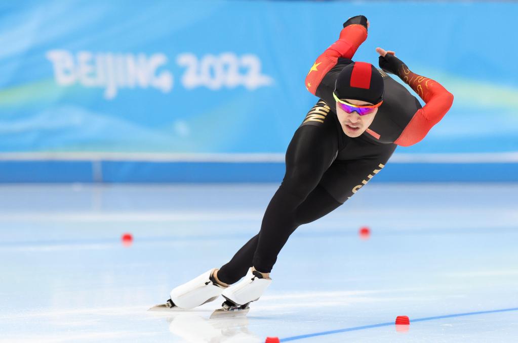 ↑2022年2月8日,中国选手宁忠岩北京2022年冬奥会速度滑冰男子1500米决赛中。