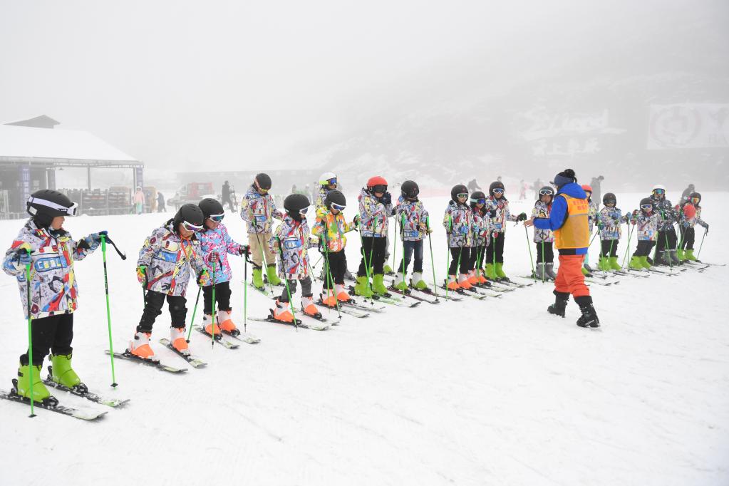 ↑通石金(左一)与学员在呼和浩特市马鬃山滑雪场训练中。
