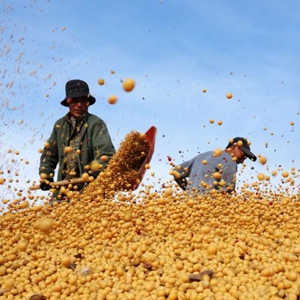 在北大荒农垦集团有限公司北安分公司赵光农场有限公司,工作人员在一处晒场的大豆堆上忙碌(2022年10月20日摄)。新华社记者王建威摄