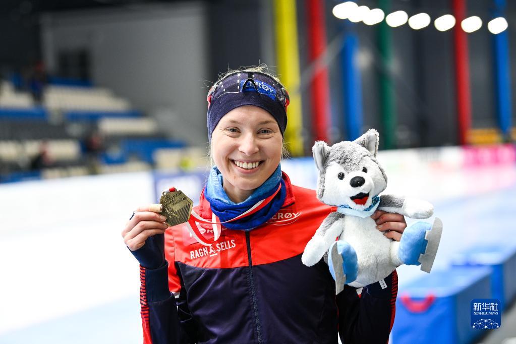 2月10日,挪威选手维克隆德在女子3000米A组比赛后展示金牌,她以4分05秒96的成绩获得冠军。