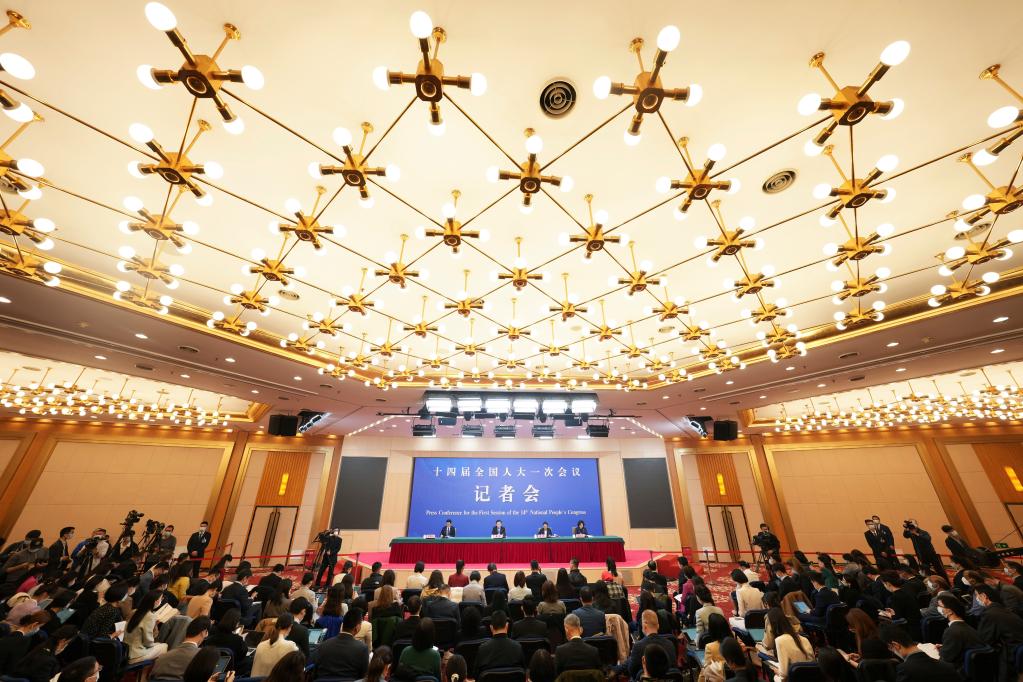 3月7日,十四届全国人大一次会议在梅地亚中心举行记者会,外交部长秦刚就中国外交政策和对外关系回答中外记者提问。这是记者在现场举手提问。新华社记者 李鑫 摄