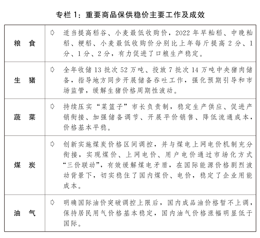 三是重要商品保供稳价进一步加强。推进重要民生商品价格调控机制落地见效,加强产运销衔接和进出口、储备吞吐调节,强化预期引导,促进价格平稳运行。坚持粮食最低收购价政策托底定位,适当提高稻谷、小麦最低收购价,稳定口粮生产。压实“菜篮子”市长负责制,加强生猪市场调控,缓解生猪猪肉价格大幅波动。规范价格指数行为,期货现货市场联动监管明显加强。创新构建煤炭价格调控监管长效机制,引导煤炭价格在合理区间运行,积极应对国际油气价格大幅上涨,保障居民用电用气需求和价格稳定。