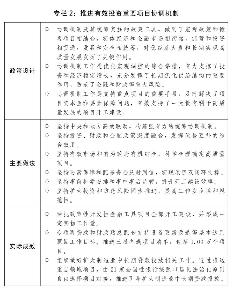 一是投资关键作用充分发挥。建立并高效运转推进有效投资重要项目协调机制,强化用地、环评、用能等要素保障和重大问题协调,做到“资金、要素跟着项目走”,加快推进重点任务落实和重大项目建设,努力形成更多实物工作量。创新设立政策性开发性金融工具,分两批投放基金7400亿元,为重大项目建设补充资本金,支持的2700多个重大项目已全部开工。通过专项再贷款与财政贴息配套支持重点领域设备更新改造,推动扩大制造业中长期贷款投放。适度超前开展基础设施投资,推进“十四五”规划102项重大工程实施,新型基础设施加快布局,川藏铁路全面建设取得良好开局,装机规模全球第二大的白鹤滩水电站全面投产,白鹤滩至江苏、浙江特高压直流输电工程运行,小洋山北侧集装箱码头(陆域部分)、平陆运河工程、南水北调中线引江补汉工程等开工建设。发挥中央预算内投资撬动作用。加快地方政府专项债券发行使用并进一步扩大支持范围。鼓励引导社会资本盘活老项目、投入新项目,促进存量资产和新增投资良性循环,已累计发行上市基础设施领域不动产投资信托基金(REITs)试点项目24个,总发行规模超过780亿元。全面推进城镇老旧小区改造,全国实际新开工老旧小区改造5.25万个。城市基础设施建设短板加快补齐,城市燃气管道等老化更新改造积极推进。全国固定资产投资(不含农户)57.21万亿元,增长5.1%;其中,基础设施、制造业投资分别增长9.4%、9.1%,一定程度弥补了消费收缩缺口。