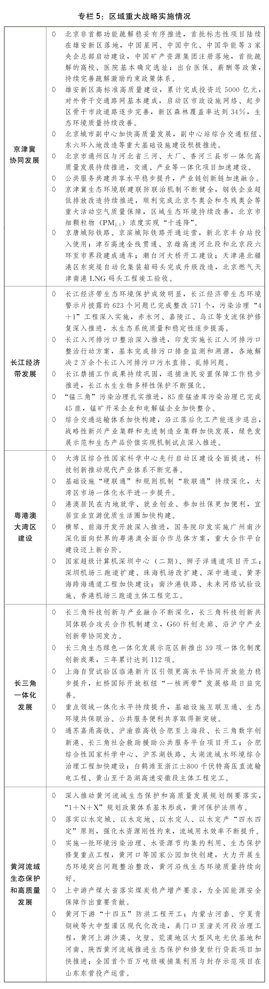 一是区域重大战略扎实推进。京津冀协同发展水平不断提升,一批央企、医院、高校等疏解项目在雄安新区落地,津冀港口群基础设施不断完善,“轨道上的京津冀”更加便捷。长江经济带绿色高质量发展有力推进,长江保护法深入贯彻实施,生态环境突出问题整改、污染治理“4+1”工程成效明显,入河排污口整治等专项行动深入实施,长江流域重点水域十年禁渔进展良好。大湾区综合性国家科学中心先行启动区加快建设,设施联通和规则衔接不断深化,横琴、前海、南沙、河套等重大合作平台建设深入推进。积极推动长三角科创与产业融合发展,G60科创走廊、沿沪宁产业创新带协同发力的创新空间布局不断优化,基础设施、生态环境、公共服务等重点领域一体化水平明显提升。黄河流域生态环境保护、水安全保障、文化保护传承弘扬等专项规划出台实施,黄河流域生态保护和高质量发展先行区加快建设,黄河生态保护治理五大攻坚行动稳步推进。