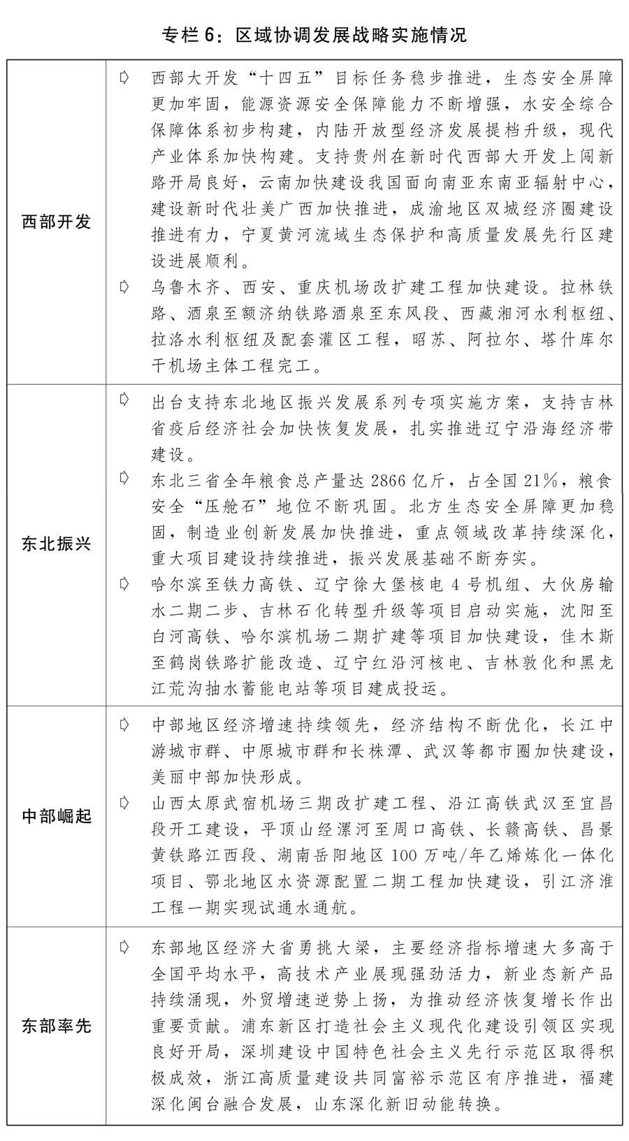 一是扎实推进区域协调发展战略。推动西部大开发形成新格局,做大做强特色优势产业,筑牢生态安全屏障,不断拓展国家发展的战略回旋空间。推动东北全面振兴取得新突破,完善支持东北全面振兴政策举措,支持东北地区中心城市及城市群提质增效,更好维护国家粮食、生态、能源等安全。促进中部地区加快崛起,构建以先进制造业为支撑的现代产业体系,推进高质量发展年度重大工程项目建设。鼓励东部地区加快推进现代化,充分发挥对全产业链的稳链固链强链作用。提高中西部和东北地区开放水平,巩固东部沿海地区开放先导地位,推动安徽更好发挥连接中部地区与长三角地区的作用,推动江西等内陆开放型经济试验区建设。更好发挥国家级新区引领示范作用。支持欠发达地区、革命老区、民族地区、生态退化地区、资源型地区和老工业城市等加快发展。加大力度推进兴边富民、稳边固边。发展海洋经济,高水平建设海洋创新示范平台,加快建设海洋强国。