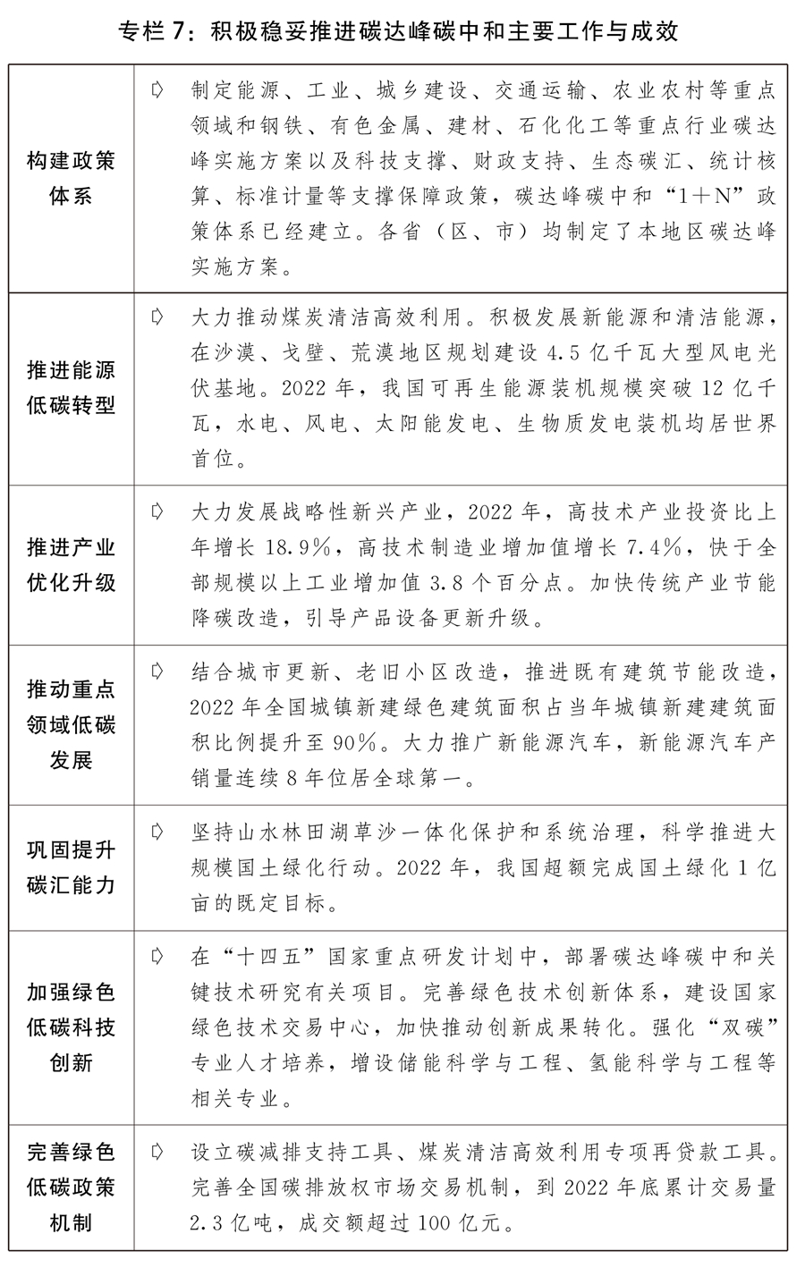 二是碳达峰碳中和积极稳妥推进。碳达峰碳中和“1+N”政策体系构建完成,重点领域碳达峰实施方案和配套保障措施制定出台,“碳达峰十大行动”扎实推进。全国碳排放权交易市场平稳运行。坚持“先立后改”,加快建设先进清洁支撑性煤电,推动煤电机组节能降碳改造、灵活性改造、供热改造“三改联动”,积极发展新能源和清洁能源,第一批以沙漠、戈壁、荒漠地区为重点的大型风电光伏基地加快建设,我国可再生能源总装机突破12亿千瓦。重点行业节能降碳大力推进,提高新建建筑节能水平,积极发展绿色建筑,大力推广新能源汽车,持续推动充电基础设施建设,加快推进大宗货物和中长距离货物运输“公转铁”、“公转水”。单位国内生产总值二氧化碳排放下降0.8%。积极参与联合国气候变化沙姆沙伊赫大会各项谈判磋商,推动大会取得积极成果。