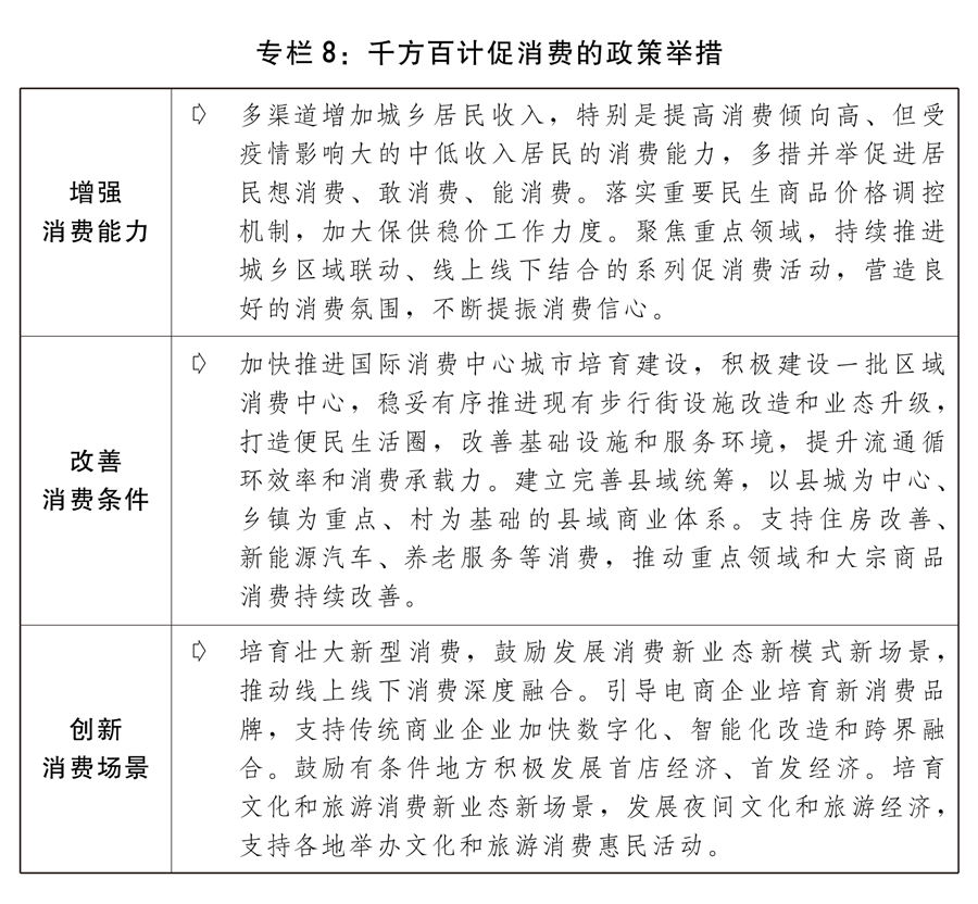 一是综合施策释放消费潜力。把恢复和扩大消费摆在优先位置,增强消费能力,改善消费条件,创新消费场景。顺应居民消费升级趋势,打造内容丰富、品质精良、结构合理的高质量消费供给体系,持续提升传统消费,加快培育新型消费,不断壮大消费热点。稳定汽车等大宗消费,强化停车设施建设改造,优化停车设施供给结构,加快推进公路沿线、交通枢纽场站、居住区等充电设施设备建设,推动公共领域车辆全面电动化。鼓励有条件的地方对购买绿色智能家电、绿色建材等予以支持,持续开展家电生产企业回收目标责任制行动。采取有效措施推动生活服务消费恢复,规范旅游市场秩序,大力发展城市微旅游、乡村旅游和短途周边游。落实带薪休假制度。推进即时零售、直播电商、云展会等新模式健康发展,拓展沉浸式交互式购物体验。支持刚性和改善性住房、新能源汽车、养老服务、教育医疗文化体育服务等消费。引导培育信息消费。开展智慧商圈、智慧商店、智慧景区、旅游城市和绿色商场示范创建,扩大绿色产品供给和消费。促进老字号创新发展。高水平办好2023年中国品牌日系列活动,不断提升中国品牌知名度和影响力,推动国潮品牌消费繁荣发展。营造安心放心的消费环境,加大消费品质量安全监管力度,强化消费者权益保护。