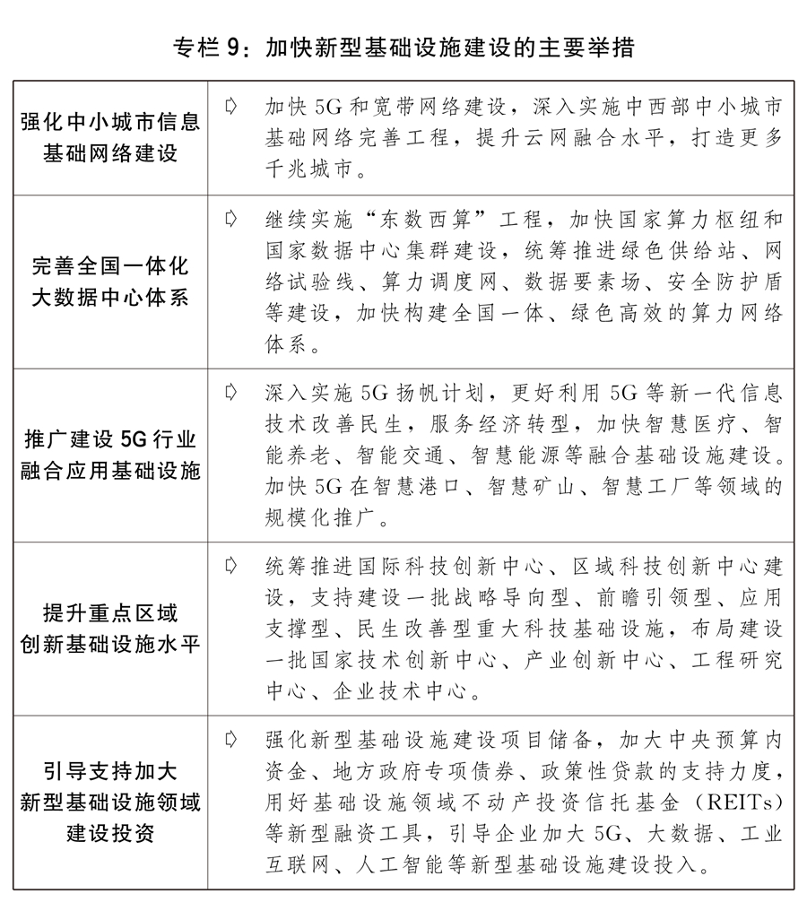 三是持续推进重大基础设施建设。优化基础设施布局、结构、功能和系统集成,构建现代化基础设施体系。推动川藏铁路、沿江沿海高铁、国家水网等重大项目建设,加快重大引调水、防洪减灾、西部陆海新通道、小洋山北侧集装箱码头开发建设,推进川藏公路G318线提质改造,加快沿边国道G219线、G331线待贯通路段建设,推进中西部铁路、长江黄金水道、过江通道、重点城市群都市圈城际铁路和市域(郊)铁路建设。加快5G、人工智能、大数据、物联网、工业互联网等新型基础设施建设,推动智慧高速公路建设,推进民用空间基础设施建设,加快推进海南商业航天发射场建设,优化升级数字基础设施,加快建设信息网络基础设施,推进云网融合和算网协同发展,有序推进基础设施智能升级。