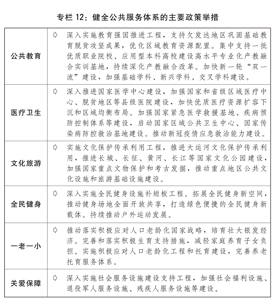 六是健全公共服务体系。出台新版国家基本公共服务标准,开展基本公共服务均等化监测评估。持续推动生活性服务业补短板上水平,研究出台推进高品质生活城市建设的政策措施。加强农村公共服务体系建设,健全常住地提供基本公共服务制度。深入实施积极应对人口老龄化国家战略,发展养老事业和养老产业,扩大普惠养老供给,构建居家社区机构相协调、医养康养相结合的养老服务体系,加强老年健康服务和管理,研究支持银发经济发展的政策体系。推动落实积极生育支持措施,发展普惠托育服务体系,降低生育、养育、教育成本,促进人口长期均衡发展。持续完善“一老一小”服务体系,扩大养老托育服务供给。有序推进第二批国家儿童友好城市建设。大力发展社会主义先进文化,实施文化保护传承利用工程,加大文物和文化遗产保护力度,健全现代公共文化服务体系,推进实施国家文化数字化,创新实施文化惠民工程,建好用好国家文化公园,推动智慧广电、智慧旅游建设,促进文化和旅游深度融合发展。繁荣发展哲学社会科学。实施全民健身设施补短板工程,推动构建更高水平的全民健身公共服务体系。推动家政进社区,提升基层家政服务网点服务能力。推动优抚医院、光荣院改革提质,加强烈士纪念设施提质改造,继续加强精神卫生福利设施、省级盲人按摩医院等建设。加强公共法律服务体系建设。